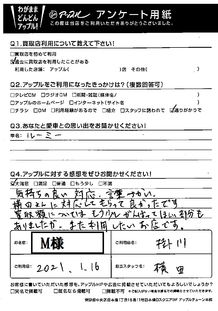 気持ちの良い対応、言葉づかい、横田さんに対応してもらって良かったです。買取額についてはもう少しがんばってほしい部分もありましたが、また利用したいお店です。