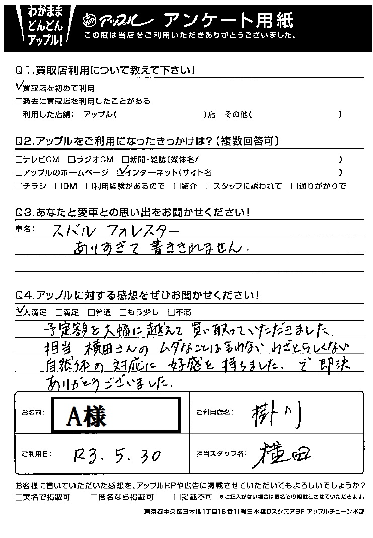 予定額を大幅に越えて買い取っていただきました。担当 横田さんのムダなことは言わない、わざとらしくない、自然体の対応に好感を持ちました。で即決。ありがとうございました。