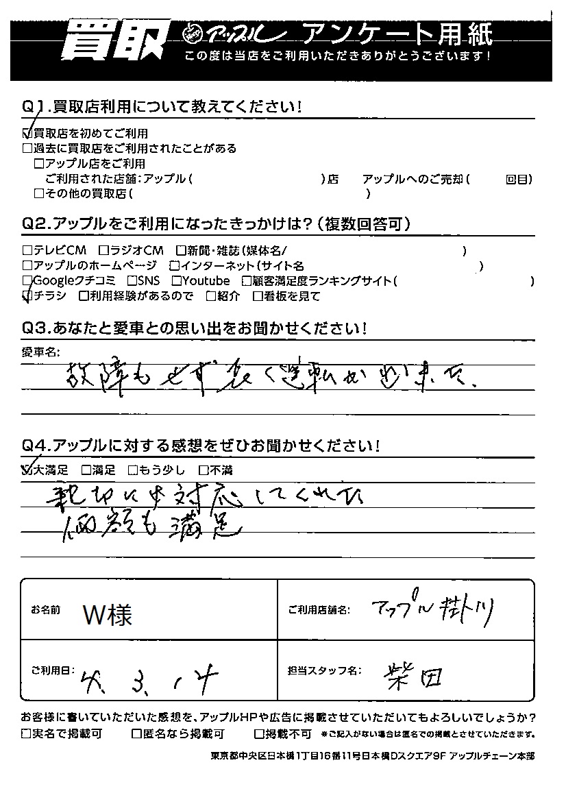 お車のご相談・ 査定だけでもOK! カンタン 入力 30秒 アップルがブランド買取始めました! お電話でも受付中! 受付時間9:00~18:00 0537-24-7778 お車のご相談・ 査定だけでもOK! カンタン 入力 30秒 アップルがブランド買取始めました! お電話でも受付中! 受付時間9:00~18:00 0537-24-7778 アップルがブランド買取始めました! お電話でも受付中! 受付時間9:00~18:00 0537-24-7778 店舗情報 在庫車 スタッフ紹介 ブログ お客様の声 キャンペーン お得 無料査定 click お客様の声 ご記入日: 2022/03/14 W様 Q:あなたと愛車との思い出をお聞かせください!故障もせず長く運転が出来た。Q:アップルに対する感想をぜひお聞かせください!大満足親切にご対応してくれた。価格も満足。担当:アップル掛川店 柴田 前へ 次へ お客様の声一覧を見る