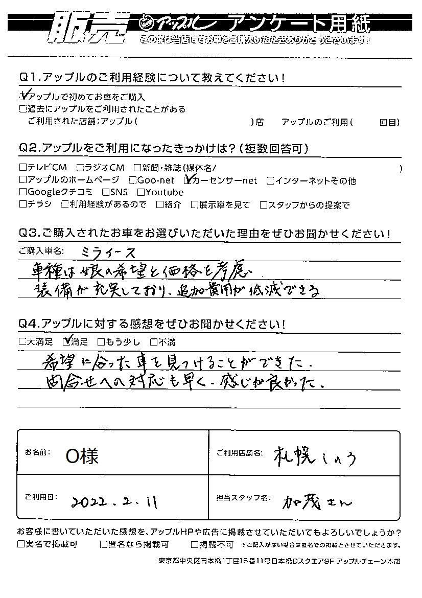 O様 車名:ダイハツ ミライース