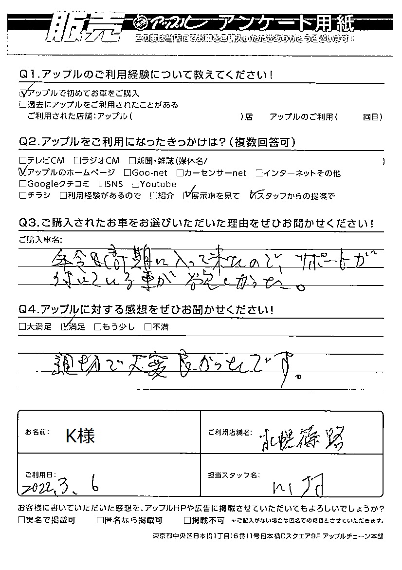 お車のご相談・ 査定だけでもOK! カンタン 入力 30秒 アップルがブランド買取始めました! お電話でも受付中! 受付時間09:30~18:30 011-676-4501 お車のご相談・ 査定だけでもOK! カンタン 入力 30秒 アップルがブランド買取始めました! お電話でも受付中! 受付時間09:30~18:30 011-676-4501 アップルがブランド買取始めました! お電話でも受付中! 受付時間09:30~18:30 011-676-4501 店舗情報 在庫車 スタッフ紹介 ブログ お客様の声 キャンペーン 無料査定 click お客様の声 ご記入日: 2022/03/06 K様 🍎ご購入されたお車をお選びいただいた理由をぜひお聞かせください!年令高期に入って来たので、サポートが付いてる車が欲しかった。🍎アップルに対する感想をぜひお聞かせください!親切で大変良かったです。 前へ 次へ お客様の声一覧を見る