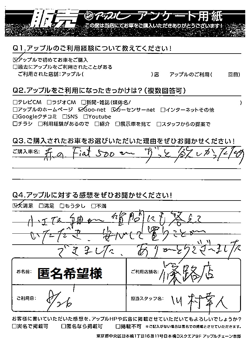 匿名希望様 車名:フィアット 500(チンクエチェント)
