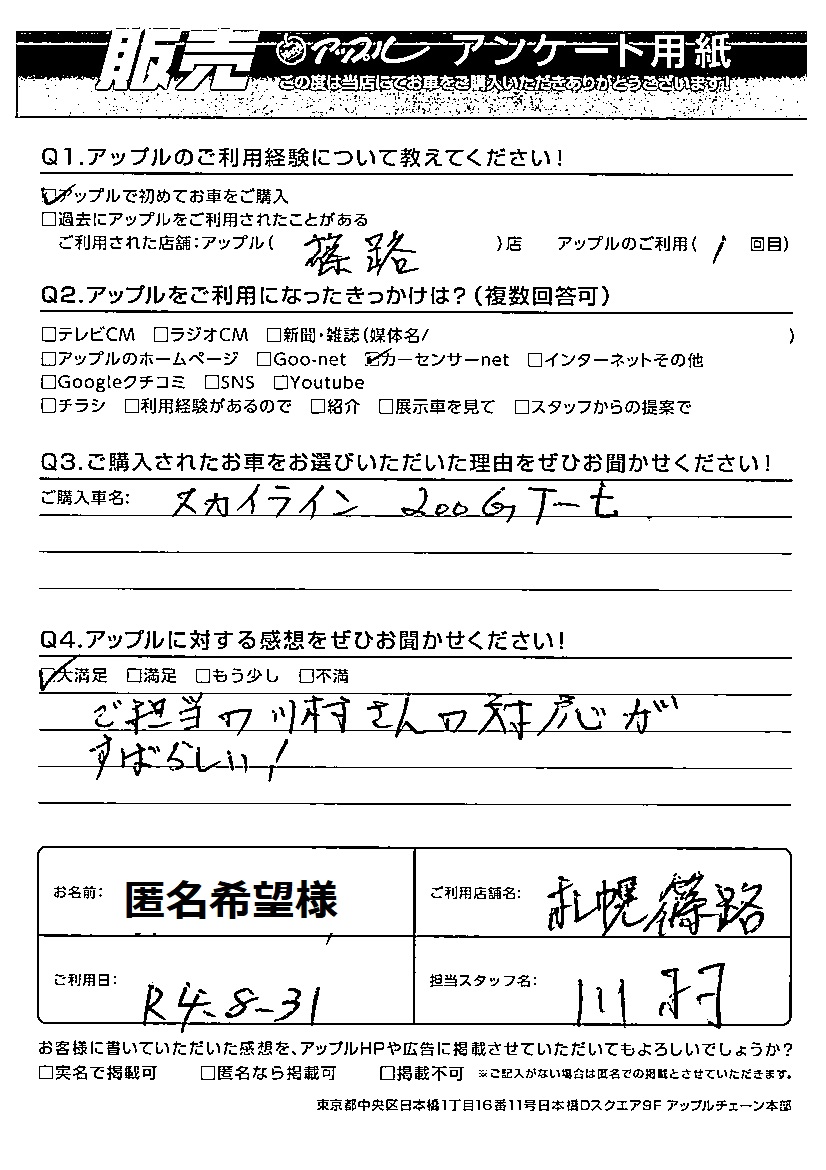 お車のご相談・ 査定だけでもOK! カンタン 入力 30秒 アップルがブランド買取始めました! お電話でも受付中! 受付時間09:30~18:30 011-676-4501 お車のご相談・ 査定だけでもOK! カンタン 入力 30秒 アップルがブランド買取始めました! お電話でも受付中! 受付時間09:30~18:30 011-676-4501 アップルがブランド買取始めました! お電話でも受付中! 受付時間09:30~18:30 011-676-4501 店舗情報 在庫車 スタッフ紹介 ブログ お客様の声 キャンペーン 無料査定 click お客様の声 ご記入日: 2022/08/31 匿名希望様 車名:日産 スカイライン(セダン) 🍎アップルに対する感想をぜひお聞かせください!ご担当の川村さんの対応がすばらしい!! 前へ 次へ お客様の声一覧を見る