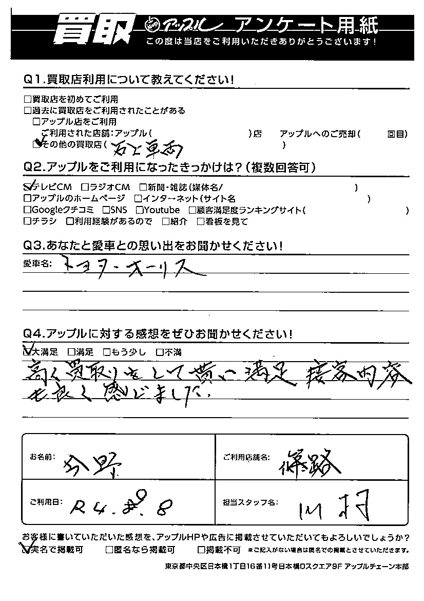 お車のご相談・ 査定だけでもOK! カンタン 入力 30秒 アップルがブランド買取始めました! お電話でも受付中! 受付時間09:30~18:30 011-676-4501 お車のご相談・ 査定だけでもOK! カンタン 入力 30秒 アップルがブランド買取始めました! お電話でも受付中! 受付時間09:30~18:30 011-676-4501 アップルがブランド買取始めました! お電話でも受付中! 受付時間09:30~18:30 011-676-4501 店舗情報 在庫車 スタッフ紹介 ブログ お客様の声 キャンペーン 無料査定 click お客様の声 ご記入日: 2022/09/08 今野様 車名:トヨタ オーリス 🍏アップルに対する感想をぜひお聞かせください!高く買取りをして貰い満足。接客内容も良く感じました。 前へ 次へ お客様の声一覧を見る