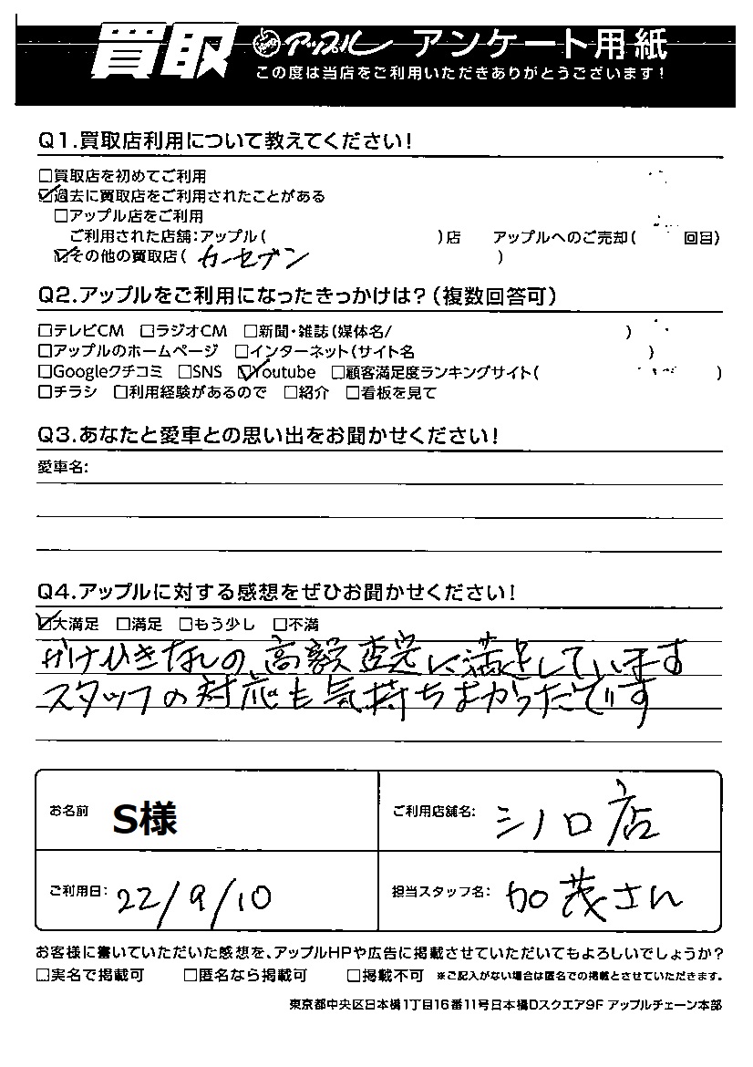 お車のご相談・ 査定だけでもOK! カンタン 入力 30秒 アップルがブランド買取始めました! お電話でも受付中! 受付時間09:30~18:30 011-676-4501 お車のご相談・ 査定だけでもOK! カンタン 入力 30秒 アップルがブランド買取始めました! お電話でも受付中! 受付時間09:30~18:30 011-676-4501 アップルがブランド買取始めました! お電話でも受付中! 受付時間09:30~18:30 011-676-4501 店舗情報 在庫車 スタッフ紹介 ブログ お客様の声 キャンペーン 無料査定 click お客様の声 ご記入日: 2022/09/10 S様 🍏アップルに対する感想をぜひお聞かせください!かけひきなしの高額査定に満足しています。スタッフの対応も気持ちよかったです。 前へ 次へ お客様の声一覧を見る