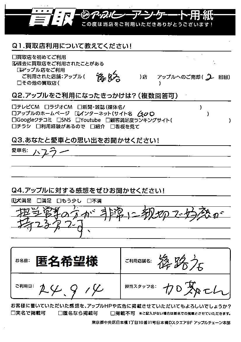 お車のご相談・ 査定だけでもOK! カンタン 入力 30秒 アップルがブランド買取始めました! お電話でも受付中! 受付時間09:30~18:30 011-676-4501 お車のご相談・ 査定だけでもOK! カンタン 入力 30秒 アップルがブランド買取始めました! お電話でも受付中! 受付時間09:30~18:30 011-676-4501 アップルがブランド買取始めました! お電話でも受付中! 受付時間09:30~18:30 011-676-4501 店舗情報 在庫車 スタッフ紹介 ブログ お客様の声 キャンペーン 無料査定 click お客様の声 ご記入日: 2022/09/14 匿名希望様 車名:スズキ ハスラー 🍏アップルに対する感想をぜひお聞かせください!担当営業の方が非常に親切で好感が持てる方です。 前へ 次へ お客様の声一覧を見る