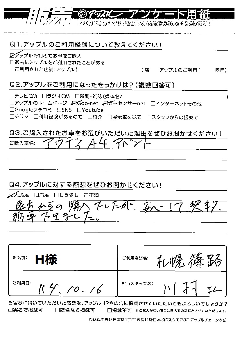 お車のご相談・ 査定だけでもOK! カンタン 入力 30秒 アップルがブランド買取始めました! お電話でも受付中! 受付時間09:30~18:30 011-676-4501 お車のご相談・ 査定だけでもOK! カンタン 入力 30秒 アップルがブランド買取始めました! お電話でも受付中! 受付時間09:30~18:30 011-676-4501 アップルがブランド買取始めました! お電話でも受付中! 受付時間09:30~18:30 011-676-4501 店舗情報 在庫車 スタッフ紹介 ブログ お客様の声 キャンペーン 無料査定 click お客様の声 ご記入日: 2022/10/16 H様 車名:アウディ A4アバント 🍎アップルに対する感想をぜひお聞かせください!遠方からの購入でしたが、安心して契約、納車できました。 前へ 次へ お客様の声一覧を見る