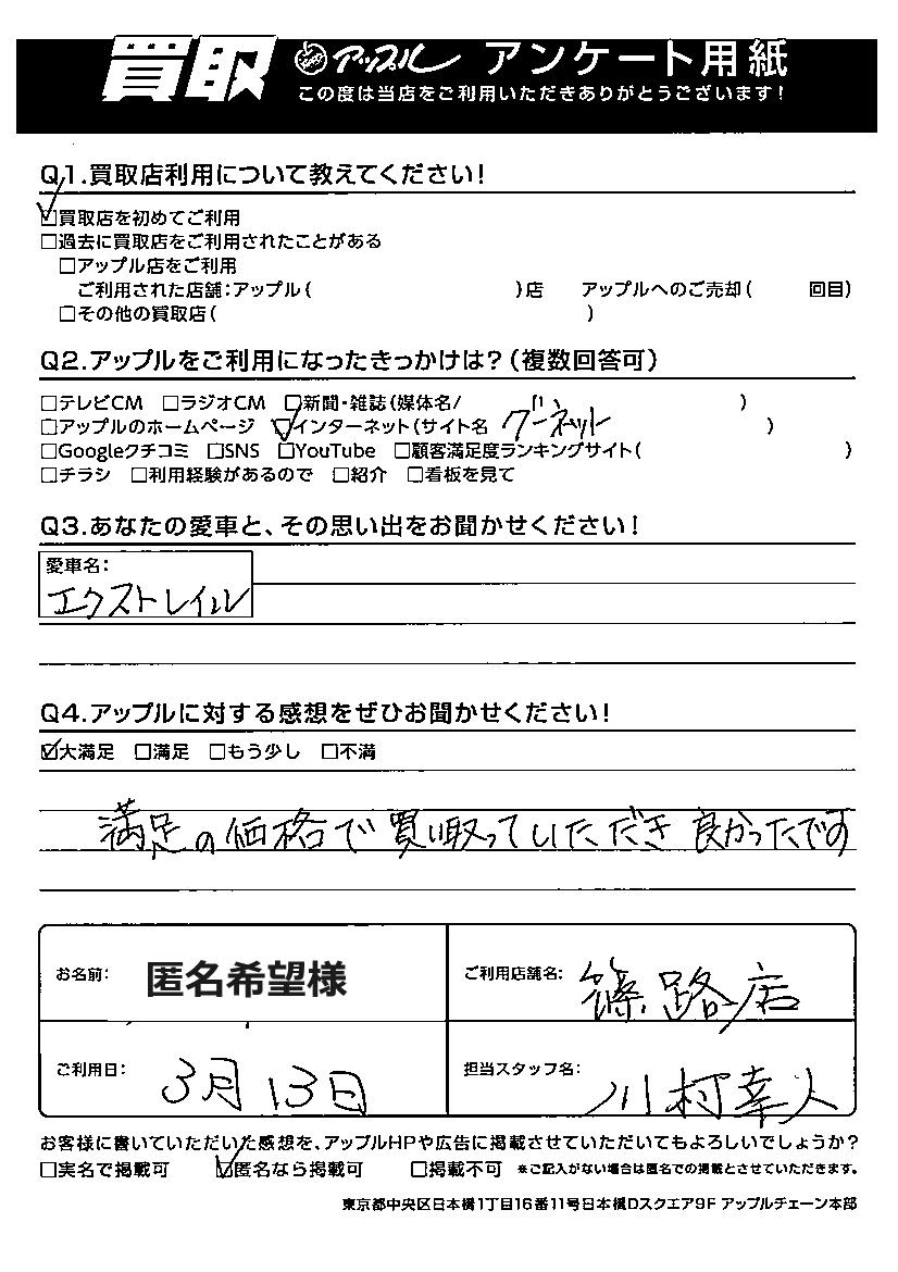 お車のご相談・ 査定だけでもOK! カンタン 入力 30秒 アップルがブランド買取始めました! お電話でも受付中! 受付時間09:30~18:30 011-676-4501 お車のご相談・ 査定だけでもOK! カンタン 入力 30秒 アップルがブランド買取始めました! お電話でも受付中! 受付時間09:30~18:30 011-676-4501 アップルがブランド買取始めました! お電話でも受付中! 受付時間09:30~18:30 011-676-4501 店舗情報 在庫車 スタッフ紹介 ブログ お客様の声 キャンペーン 無料査定 click お客様の声 ご記入日: 2024/03/13 匿名希望様 車名:日産 エクストレイル 🍏アップルに対する感想をぜひお聞かせください!満足の価格で買取っていただき良かったです。 前へ 次へ お客様の声一覧を見る
