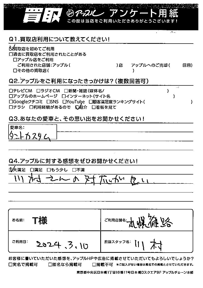 お車のご相談・ 査定だけでもOK! カンタン 入力 30秒 アップルがブランド買取始めました! お電話でも受付中! 受付時間09:30~18:30 011-676-4501 お車のご相談・ 査定だけでもOK! カンタン 入力 30秒 アップルがブランド買取始めました! お電話でも受付中! 受付時間09:30~18:30 011-676-4501 アップルがブランド買取始めました! お電話でも受付中! 受付時間09:30~18:30 011-676-4501 店舗情報 在庫車 スタッフ紹介 ブログ お客様の声 キャンペーン 無料査定 click お客様の声 ご記入日: 2024/03/10 T様 車名:ダイハツ タント 🍏アップルに対する感想をぜひお聞かせください!川村さんの対応が良い 前へ 次へ お客様の声一覧を見る