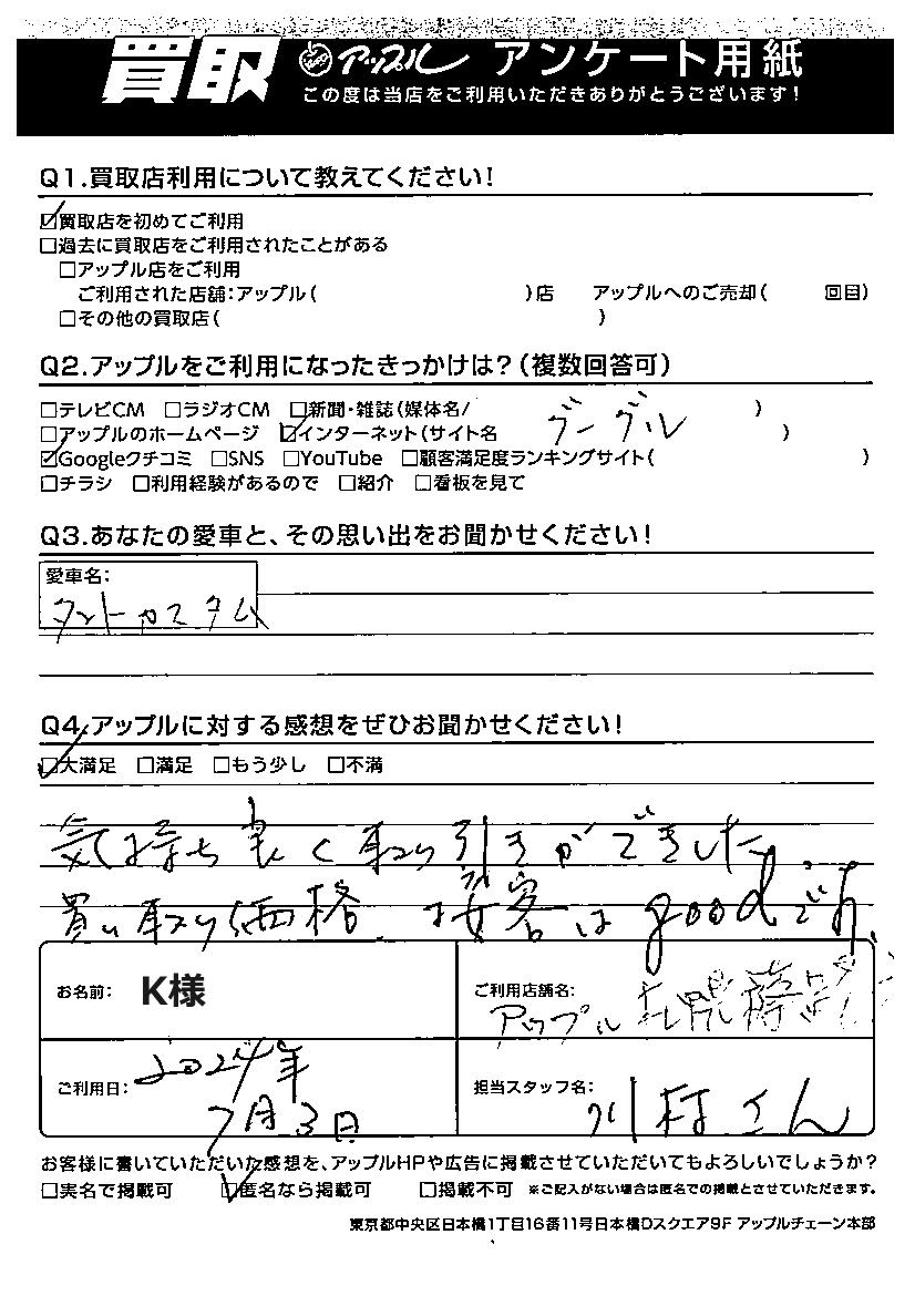 お車のご相談・ 査定だけでもOK! カンタン 入力 30秒 アップルがブランド買取始めました! お電話でも受付中! 受付時間09:30~18:30 011-676-4501 お車のご相談・ 査定だけでもOK! カンタン 入力 30秒 アップルがブランド買取始めました! お電話でも受付中! 受付時間09:30~18:30 011-676-4501 アップルがブランド買取始めました! お電話でも受付中! 受付時間09:30~18:30 011-676-4501 店舗情報 在庫車 スタッフ紹介 ブログ お客様の声 キャンペーン 無料査定 click お客様の声 ご記入日: 2024/07/03 K様 車名:ダイハツ タント 🍏アップルに対する感想をぜひお聞かせください!気持ち良く取り引きができた。買い取り価格、接客はgoodです。 前へ 次へ お客様の声一覧を見る