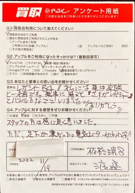 お車のご相談・ 査定だけでもOK! カンタン 入力 30秒 アップルがブランド買取始めました! お電話でも受付中! 受付時間10:00~19:00 0120-234-832 お車のご相談・ 査定だけでもOK! カンタン 入力 30秒 アップルがブランド買取始めました! お電話でも受付中! 受付時間10:00~19:00 0120-234-832 アップルがブランド買取始めました! お電話でも受付中! 受付時間10:00~19:00 0120-234-832 店舗情報 在庫車 スタッフ紹介 ブログ お客様の声 キャンペーン お得 無料査定 click お客様の声 ご記入日: 2022/11/19 東京都北区 T・M様 車名:スバル レガシィB4 お車:レガシィB4Q.愛車との思い出は? A.私には車は家族と一緒です。無事に帰ると「さすがレガチャン」とハンドルをなでていました。ありがとうQ.アップルの感想は? A.満足:スタッフの方は感じ良く思いました。ただ足元が寒かった。電気ヒーターがあれば! 前へ 次へ お客様の声一覧を見る