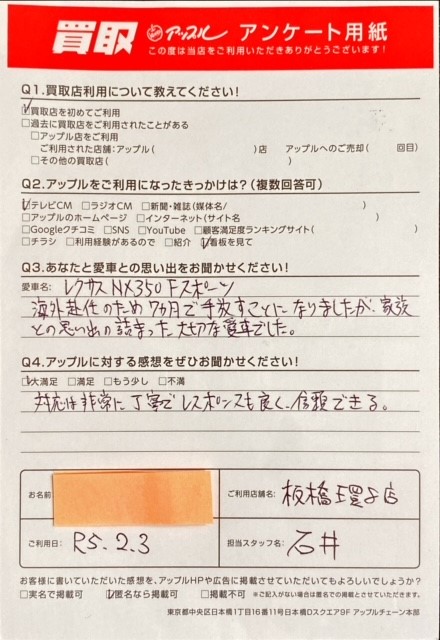 東京都板橋区 S・S様  車名:レクサス NX (国内仕様 右H)