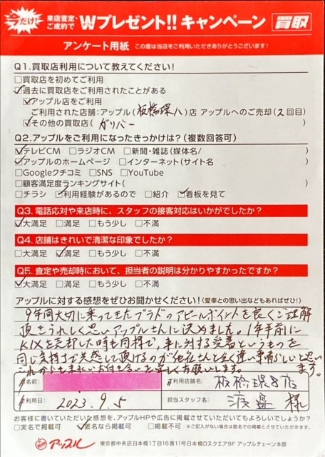 Q.アップルの感想は? A.9年間大切に乗ってきたプラドのアピールポイントを良くご理解頂きうれしく思いアップルさんに決めました。1年半前にいKIXを売却した時も同様で、車に対する愛着というおのっを同じ気持ちで共感して頂けるのが他社さんと全く違い素晴らしいと思います。これからも末永いお付き合いを宜しくお願いします。