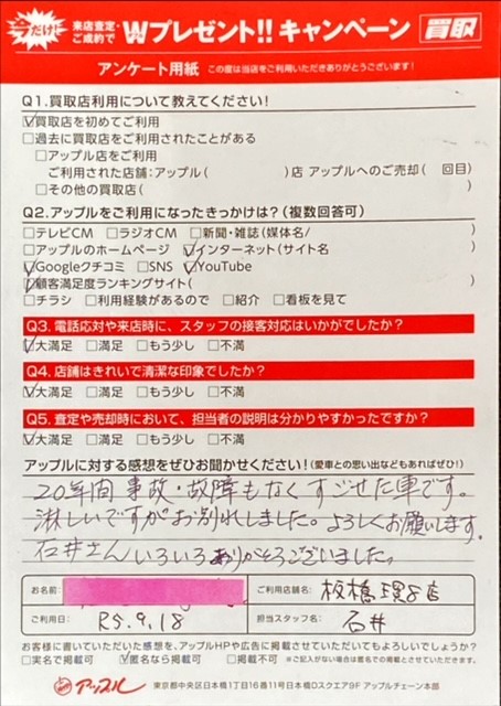 お車のご相談・ 査定だけでもOK! カンタン 入力 30秒 アップルがブランド買取始めました! お電話でも受付中! 受付時間10:00~19:00 0120-234-832 お車のご相談・ 査定だけでもOK! カンタン 入力 30秒 アップルがブランド買取始めました! お電話でも受付中! 受付時間10:00~19:00 0120-234-832 アップルがブランド買取始めました! お電話でも受付中! 受付時間10:00~19:00 0120-234-832 店舗情報 在庫車 スタッフ紹介 ブログ お客様の声 キャンペーン お得 無料査定 click お客様の声 ご記入日: 2023/09/18 東京都板橋区 T・M様 車名:トヨタ マークⅡハードトップ&H12年10月~セダン Q.アップルの感想は? A.20年間事故・故障もなくすごせた車です。寂しいですがお別れしました。よろしくお願いします。石井さんいろいろありがとうございました。 前へ 次へ お客様の声一覧を見る