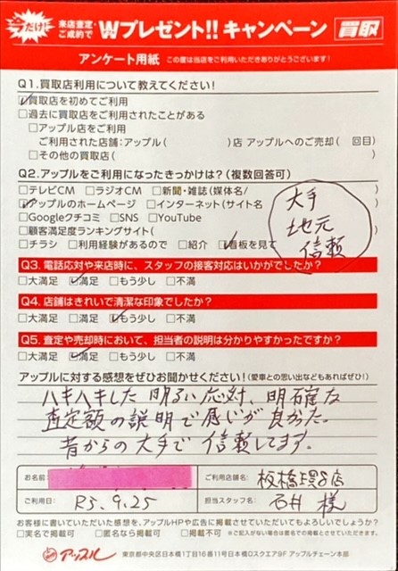 お車のご相談・ 査定だけでもOK! カンタン 入力 30秒 アップルがブランド買取始めました! お電話でも受付中! 受付時間10:00~19:00 0120-234-832 お車のご相談・ 査定だけでもOK! カンタン 入力 30秒 アップルがブランド買取始めました! お電話でも受付中! 受付時間10:00~19:00 0120-234-832 アップルがブランド買取始めました! お電話でも受付中! 受付時間10:00~19:00 0120-234-832 店舗情報 在庫車 スタッフ紹介 ブログ お客様の声 キャンペーン お得 無料査定 click お客様の声 ご記入日: 2023/09/25 東京都北区 G・T様 車名:日産 モコ Q.アップルの感想は? A.ハキハキした明るい応対、明確な査定額の説明で感じが良かった。昔からの大手で信頼してます。 前へ 次へ お客様の声一覧を見る