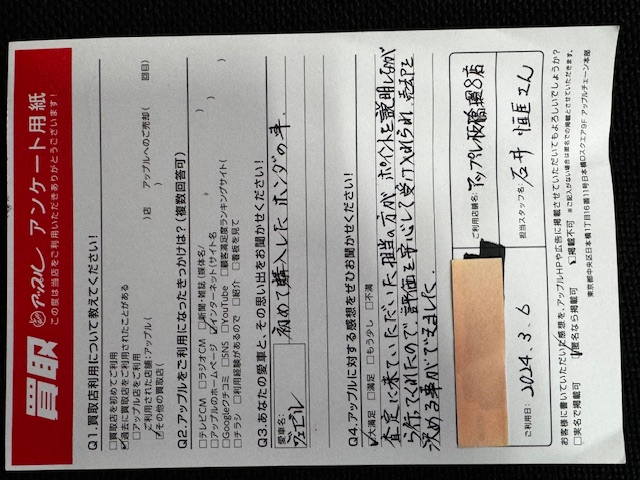 お車のご相談・ 査定だけでもOK! カンタン 入力 30秒 アップルがブランド買取始めました! お電話でも受付中! 受付時間10:00~19:00 0120-234-832 お車のご相談・ 査定だけでもOK! カンタン 入力 30秒 アップルがブランド買取始めました! お電話でも受付中! 受付時間10:00~19:00 0120-234-832 アップルがブランド買取始めました! お電話でも受付中! 受付時間10:00~19:00 0120-234-832 店舗情報 在庫車 スタッフ紹介 ブログ お客様の声 キャンペーン お得 無料査定 click お客様の声 ご記入日: 2024/03/06 東京都北区 S・S様 車名:ホンダ ヴェゼル お車:ヴェゼルHV Q.愛車との思い出は? A.初めて購入したホンダの車Q.アップルの感想は? A.大満足 査定に来て頂いた担当の方がポイントを説明しながら言ってくれたので、評価を安心して受け入れられ売却を決める事が出来ました。 前へ 次へ お客様の声一覧を見る