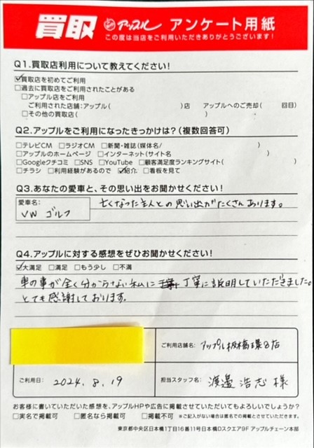 東京都江東区 匿名希望様 車名:フォルクスワーゲン ゴルフ