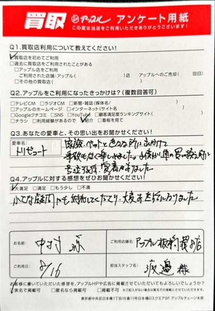 家族、ペットと色々な所に出かけて事故もなく楽しめました。子供が車の買い替え時に号泣する程、愛着がありました。