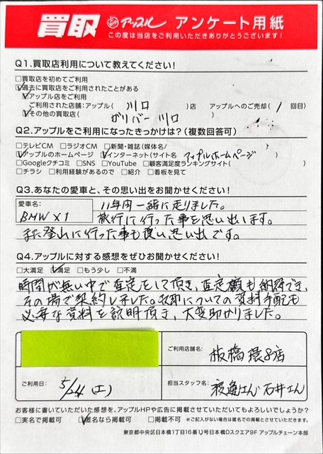 時間が無い中で査定をして頂き、査定額も納得でき、その場で契約をしました。