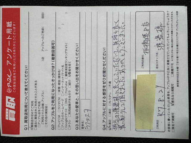 担当の渡邊様に良くして頂き気持ち良く買い取りして頂きました。ありがとうございました。