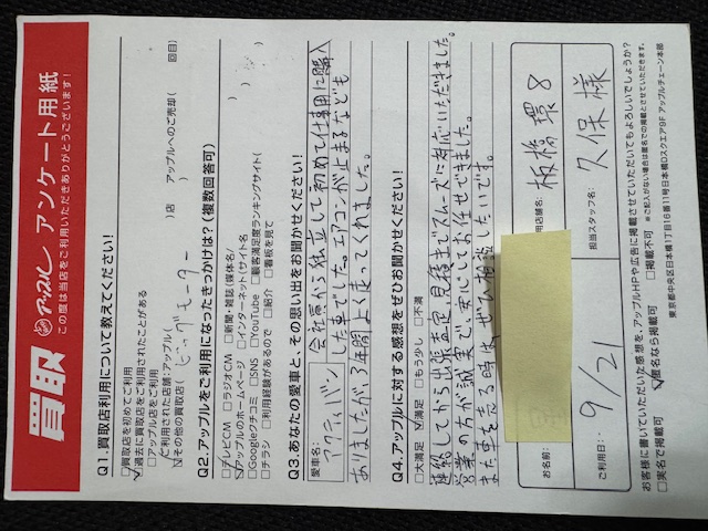連絡してから出張査定、見積迄スムーズに対応頂きました。営業の方が誠実で安心してお任せできました。