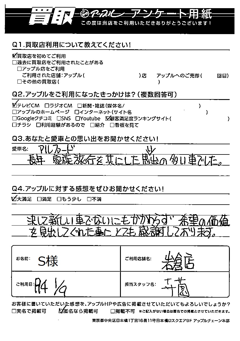 お車のご相談・ 査定だけでもOK! カンタン 入力 30秒 アップルがブランド買取始めました! お電話でも受付中! 受付時間10:00~19:00 0587-66-2021 お車のご相談・ 査定だけでもOK! カンタン 入力 30秒 アップルがブランド買取始めました! お電話でも受付中! 受付時間10:00~19:00 0587-66-2021 アップルがブランド買取始めました! お電話でも受付中! 受付時間10:00~19:00 0587-66-2021 店舗情報 在庫車 スタッフ紹介 ブログ お客様の声 キャンペーン お得 無料査定 click お客様の声 ご記入日: 2022/01/09 S様 車名:トヨタ アルファード(H27年1月~のHYBRID含む) Q あなたと愛車との思い出をお聞かせください!長年 家族旅行を共にした思い出の多い車でした。Q アップルに対する感想をぜひお聞かせください!感想:大満足決して新しい車でないにもかかわらず希望の価値を見出してくれた事にとても感謝しております。 前へ 次へ お客様の声一覧を見る