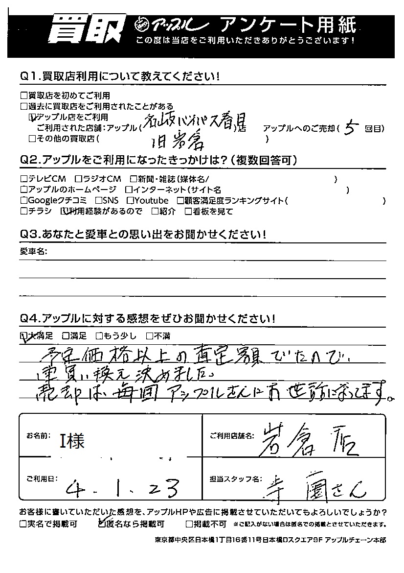 お車のご相談・ 査定だけでもOK! カンタン 入力 30秒 アップルがブランド買取始めました! お電話でも受付中! 受付時間10:00~19:00 0587-66-2021 お車のご相談・ 査定だけでもOK! カンタン 入力 30秒 アップルがブランド買取始めました! お電話でも受付中! 受付時間10:00~19:00 0587-66-2021 アップルがブランド買取始めました! お電話でも受付中! 受付時間10:00~19:00 0587-66-2021 店舗情報 在庫車 スタッフ紹介 ブログ お客様の声 キャンペーン お得 無料査定 click お客様の声 ご記入日: 2022/01/23 I様 Q アップルに対する感想をぜひお聞かせください!感想:大満足予定価格以上の査定額でたので車買い換え決めました。売却は毎回アップルさんにお世話になってます。 前へ 次へ お客様の声一覧を見る