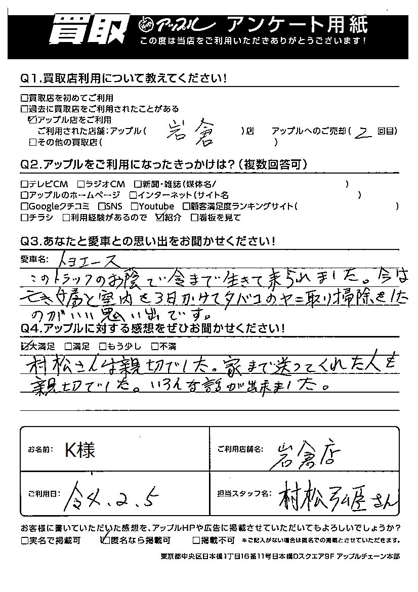 K様 車名:トヨタ トヨエース