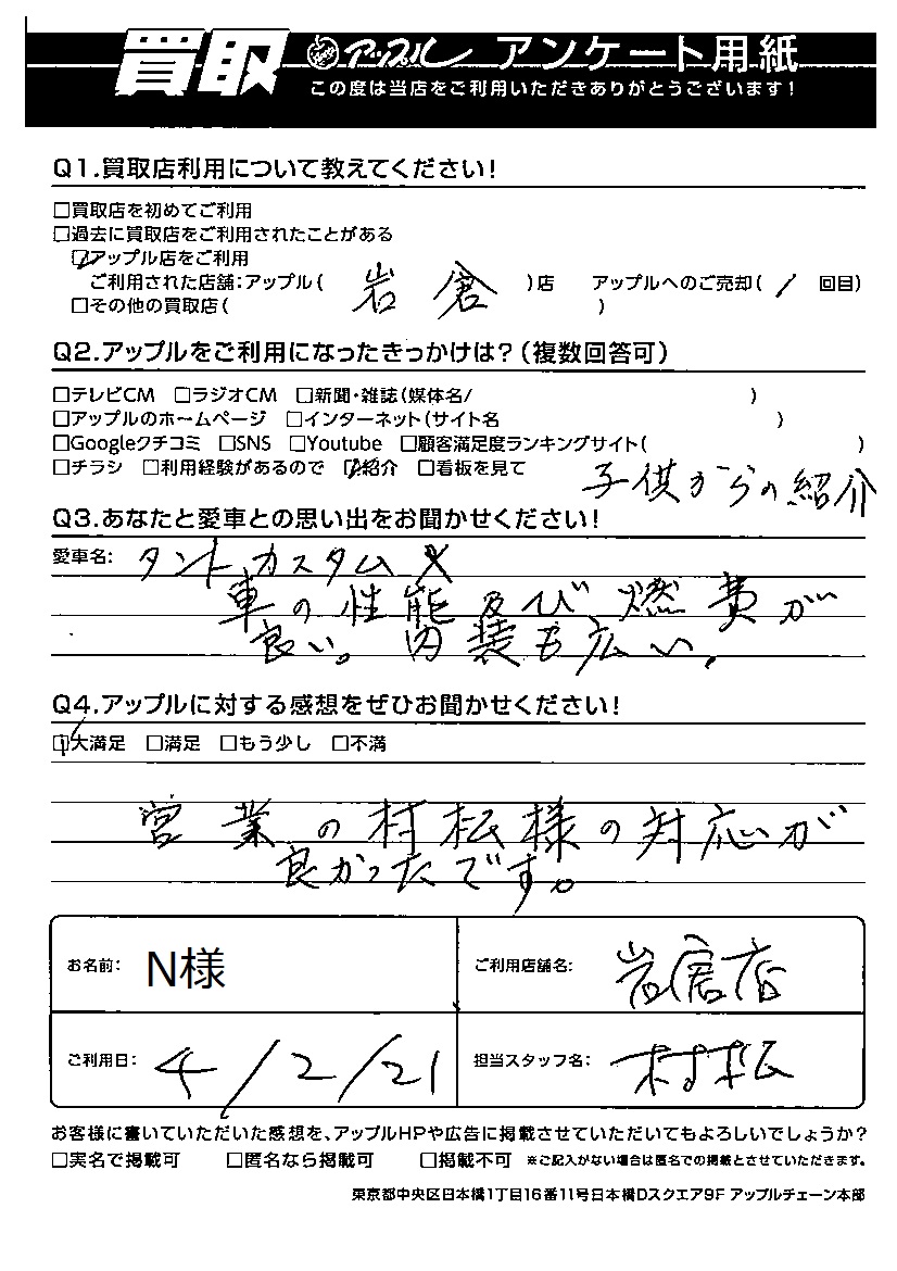 お車のご相談・ 査定だけでもOK! カンタン 入力 30秒 アップルがブランド買取始めました! お電話でも受付中! 受付時間10:00~19:00 0587-66-2021 お車のご相談・ 査定だけでもOK! カンタン 入力 30秒 アップルがブランド買取始めました! お電話でも受付中! 受付時間10:00~19:00 0587-66-2021 アップルがブランド買取始めました! お電話でも受付中! 受付時間10:00~19:00 0587-66-2021 店舗情報 在庫車 スタッフ紹介 ブログ お客様の声 キャンペーン お得 無料査定 click お客様の声 ご記入日: 2022/02/21 N様 車名:ダイハツ タント Q あなたと愛車との思い出をお聞かせください!車の性能及び燃費が良い。内装も広い。Q アップルに対する感想をぜひお聞かせください!感想:大満足営業の村松様の対応が良かったです。 前へ 次へ お客様の声一覧を見る