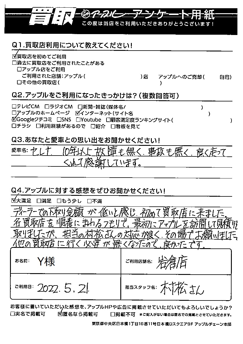ディーラーでの下取り金額が低いと感じ、初めて買取店に来ました。