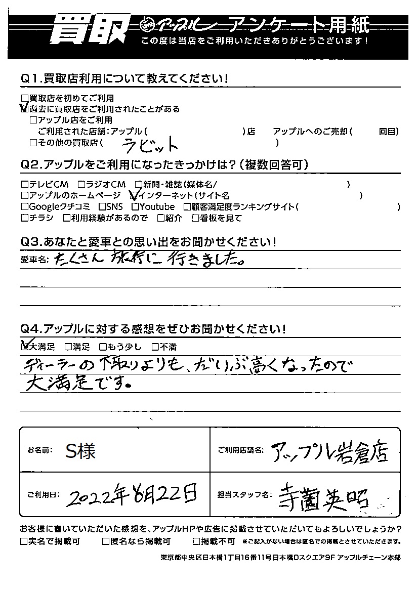 お車のご相談・ 査定だけでもOK! カンタン 入力 30秒 アップルがブランド買取始めました! お電話でも受付中! 受付時間10:00~19:00 0587-66-2021 お車のご相談・ 査定だけでもOK! カンタン 入力 30秒 アップルがブランド買取始めました! お電話でも受付中! 受付時間10:00~19:00 0587-66-2021 アップルがブランド買取始めました! お電話でも受付中! 受付時間10:00~19:00 0587-66-2021 店舗情報 在庫車 スタッフ紹介 ブログ お客様の声 キャンペーン お得 無料査定 click お客様の声 ご記入日: 2022/06/22 S様 Q あなたと愛車との思い出をお聞かせください!たくさん旅行に行きました。Q アップルに対する感想をぜひお聞かせください!感想:大満足ディーラーの下取りよりも、だいぶ高くなったので大満足です。 前へ 次へ お客様の声一覧を見る