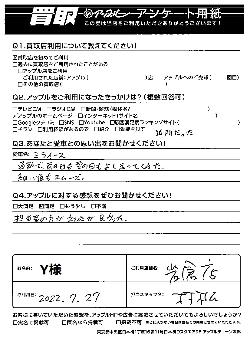 お車のご相談・ 査定だけでもOK! カンタン 入力 30秒 アップルがブランド買取始めました! お電話でも受付中! 受付時間10:00~19:00 0587-66-2021 お車のご相談・ 査定だけでもOK! カンタン 入力 30秒 アップルがブランド買取始めました! お電話でも受付中! 受付時間10:00~19:00 0587-66-2021 アップルがブランド買取始めました! お電話でも受付中! 受付時間10:00~19:00 0587-66-2021 店舗情報 在庫車 スタッフ紹介 ブログ お客様の声 キャンペーン お得 無料査定 click お客様の声 ご記入日: 2022/07/27 Y様 車名:ダイハツ ミライース Q あなたと愛車との思い出をお聞かせください!通勤で、雨の日も雪の日もよく走ってくれた。細い道もスムーズ。Q アップルに対する感想をぜひお聞かせください!感想:満足担当者の方の対応が良かった。 前へ 次へ お客様の声一覧を見る