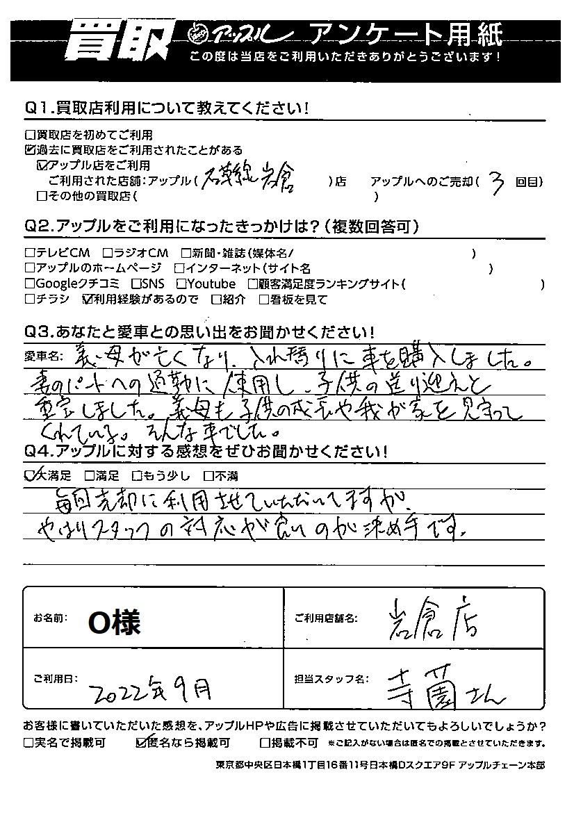 義母が亡くなり、入れ替りに車を購入しました。妻のパートへの通勤に使用し、子供の送り迎えと重宝しました。義母も子供の成長や我が家を見守ってくれている。そんな車でした。