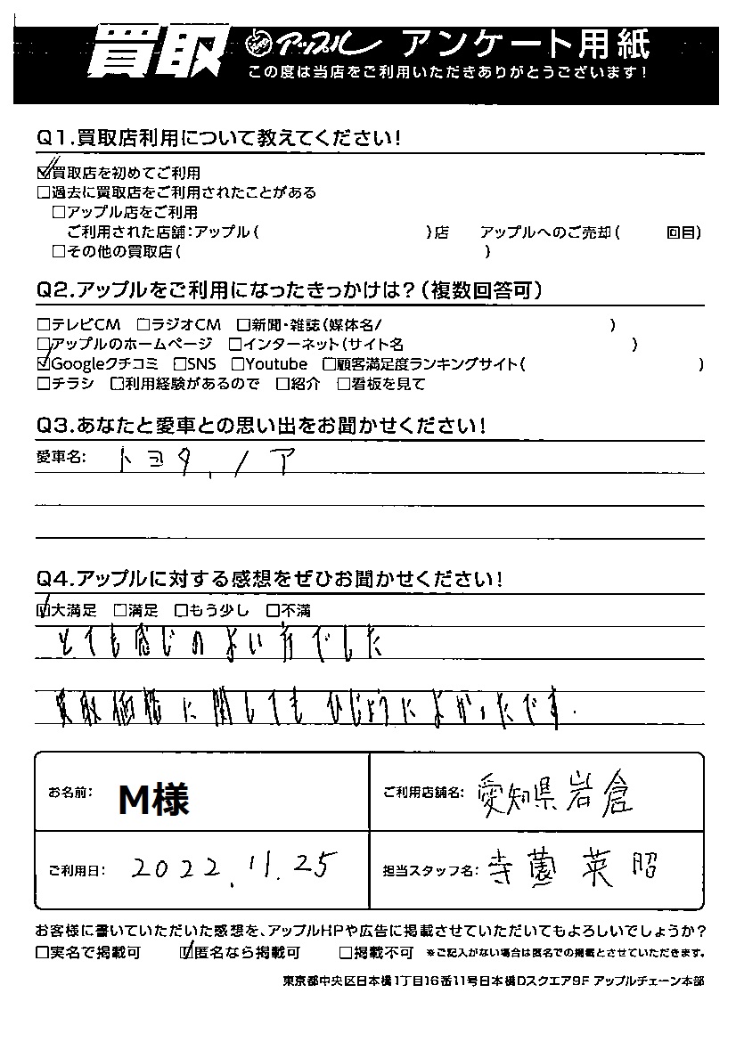 お車のご相談・ 査定だけでもOK! カンタン 入力 30秒 アップルがブランド買取始めました! お電話でも受付中! 受付時間10:00~19:00 0587-66-2021 お車のご相談・ 査定だけでもOK! カンタン 入力 30秒 アップルがブランド買取始めました! お電話でも受付中! 受付時間10:00~19:00 0587-66-2021 アップルがブランド買取始めました! お電話でも受付中! 受付時間10:00~19:00 0587-66-2021 店舗情報 在庫車 スタッフ紹介 ブログ お客様の声 キャンペーン お得 無料査定 click お客様の声 ご記入日: 2022/11/25 M様 車名:トヨタ ノア Q:アップルに対する感想をぜひお聞かせください!大満足とても感じのよい方でした。買取価格に関してもひじょうによかったです。 前へ 次へ お客様の声一覧を見る