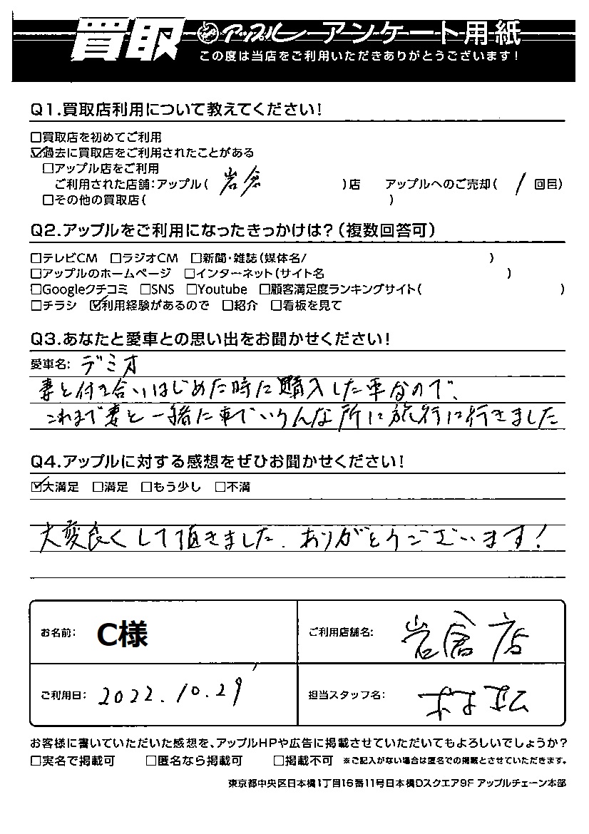 お車のご相談・ 査定だけでもOK! カンタン 入力 30秒 アップルがブランド買取始めました! お電話でも受付中! 受付時間10:00~19:00 0587-66-2021 お車のご相談・ 査定だけでもOK! カンタン 入力 30秒 アップルがブランド買取始めました! お電話でも受付中! 受付時間10:00~19:00 0587-66-2021 アップルがブランド買取始めました! お電話でも受付中! 受付時間10:00~19:00 0587-66-2021 店舗情報 在庫車 スタッフ紹介 ブログ お客様の声 キャンペーン お得 無料査定 click お客様の声 ご記入日: 2022/10/29 C様 車名:マツダ デミオ Q:あなたと愛車との思い出をぜひお聞かせください!愛車名:デミオ妻と付き合いはじめた時に購入した車なので、これまで妻と一緒に車でいろんな所に旅行に行きました。Q:アップルに対する感想をぜひお聞かせください!大満足大変良くして頂きました。ありがとうございます! 前へ 次へ お客様の声一覧を見る