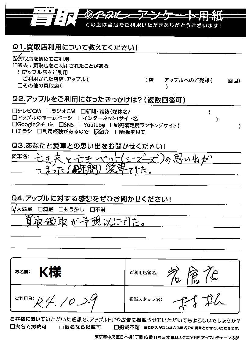 お車のご相談・ 査定だけでもOK! カンタン 入力 30秒 アップルがブランド買取始めました! お電話でも受付中! 受付時間10:00~19:00 0587-66-2021 お車のご相談・ 査定だけでもOK! カンタン 入力 30秒 アップルがブランド買取始めました! お電話でも受付中! 受付時間10:00~19:00 0587-66-2021 アップルがブランド買取始めました! お電話でも受付中! 受付時間10:00~19:00 0587-66-2021 店舗情報 在庫車 スタッフ紹介 ブログ お客様の声 キャンペーン お得 無料査定 click お客様の声 ご記入日: 2022/10/29 K様 Q:あなたと愛車との思い出をぜひお聞かせください!亡き夫と亡きペット(シーズー犬)の思い出がつまった(8年間)愛車でした。Q:アップルに対する感想をぜひお聞かせください!大満足買い取り価格が予想以上でした。 前へ 次へ お客様の声一覧を見る