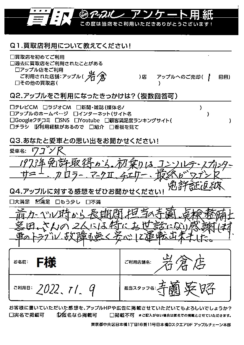 前カーベル時から長期間 担当の寺薗、点検整備士 宮田さんの2人には特にお世話になり感謝します。車のトラブル故障も無く安心して運転出来ました。