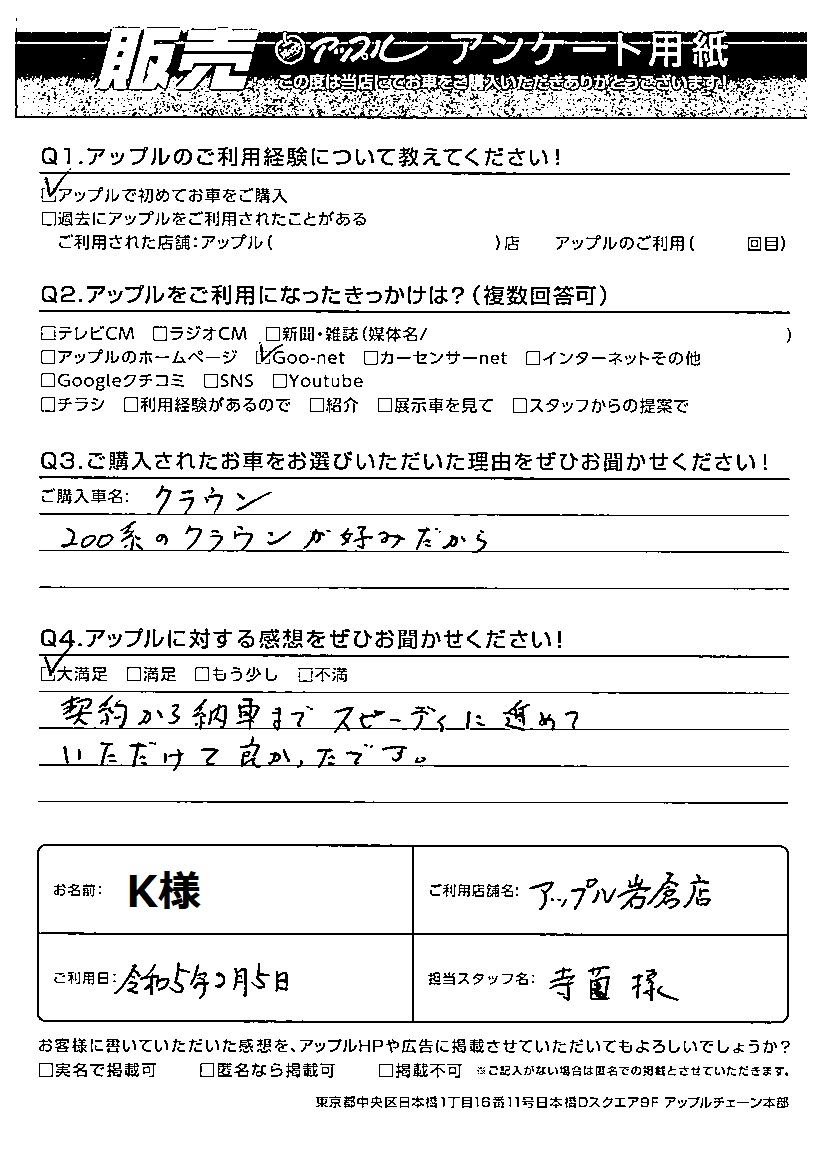 K様 車名:トヨタ クラウンセダン