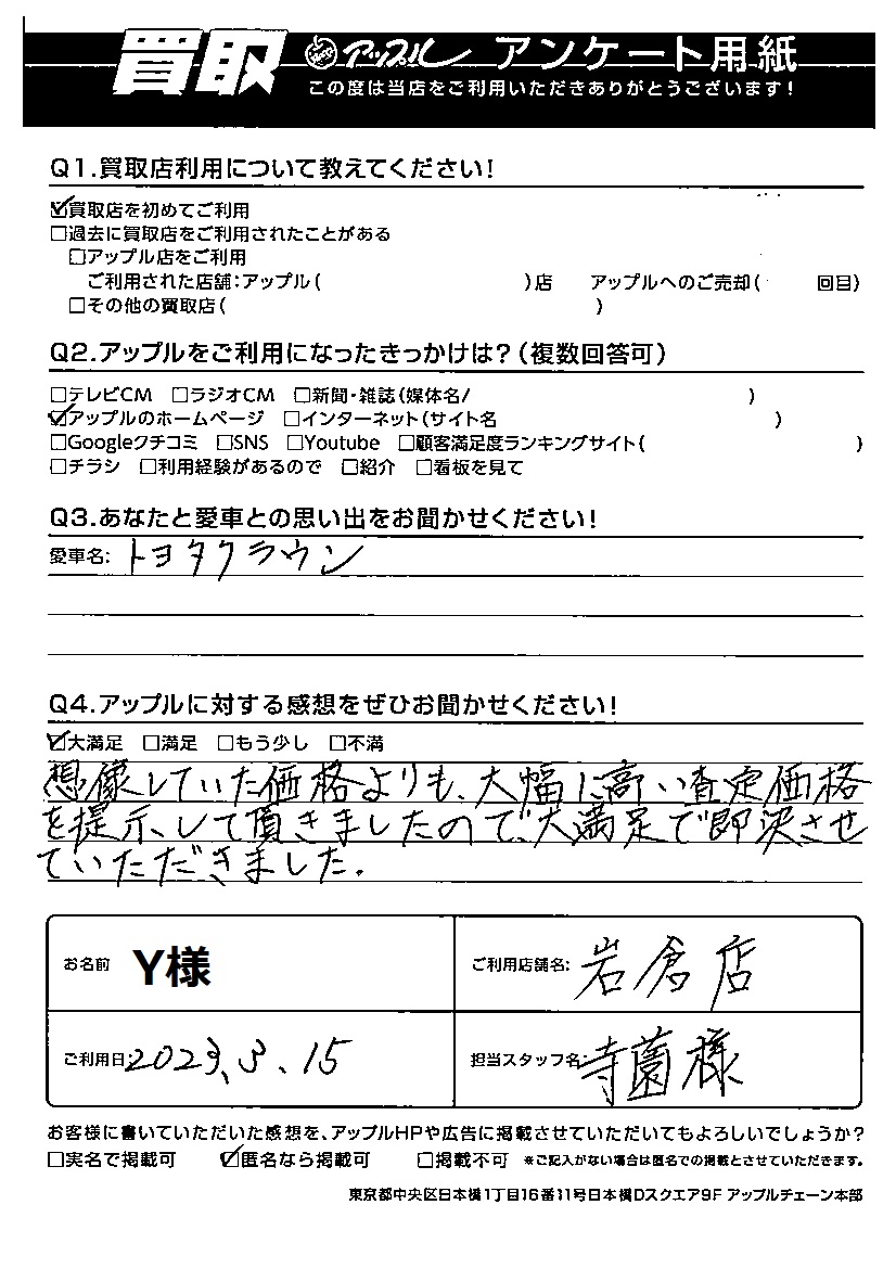 Y様 車名:トヨタ クラウンセダン