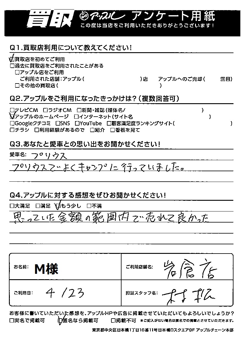 M様 車名:トヨタ プリウス(2023年3月~のPHVを含む)