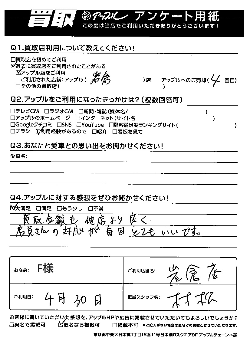 お車のご相談・ 査定だけでもOK! カンタン 入力 30秒 アップルがブランド買取始めました! お電話でも受付中! 受付時間10:00~19:00 0587-66-2021 お車のご相談・ 査定だけでもOK! カンタン 入力 30秒 アップルがブランド買取始めました! お電話でも受付中! 受付時間10:00~19:00 0587-66-2021 アップルがブランド買取始めました! お電話でも受付中! 受付時間10:00~19:00 0587-66-2021 店舗情報 在庫車 スタッフ紹介 ブログ お客様の声 キャンペーン お得 無料査定 click お客様の声 ご記入日: 2023/09/12 F様 ご利用日:2023/4/30F様 担当:村松Q買取店利用について教えてください!Aアップル岩倉店をご利用 4回目Qアップルをご利用になったきっかけは?A利用経験があるので Qアップルに対する感想をぜひお聞かせください!A大満足 買取金額も他店より良く 店員さんの対応が毎回とてもいいです。 前へ 次へ お客様の声一覧を見る