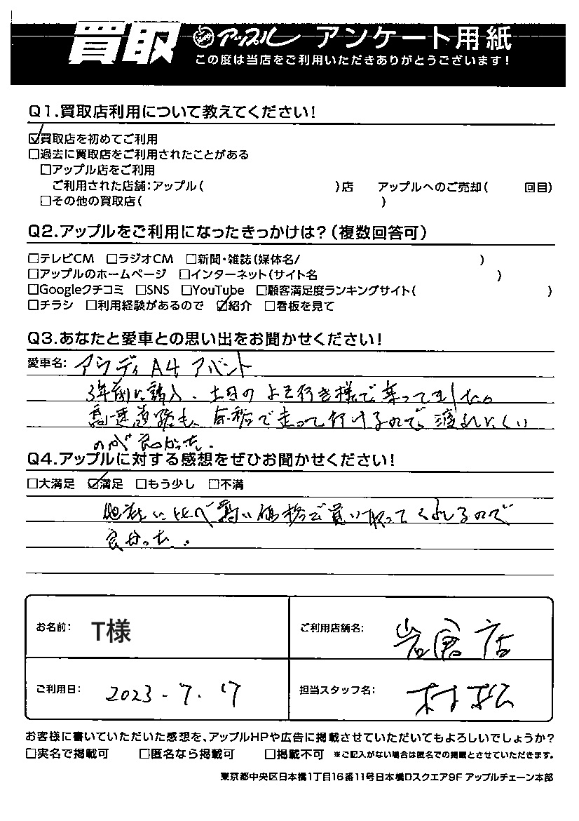 お車のご相談・ 査定だけでもOK! カンタン 入力 30秒 アップルがブランド買取始めました! お電話でも受付中! 受付時間10:00~19:00 0587-66-2021 お車のご相談・ 査定だけでもOK! カンタン 入力 30秒 アップルがブランド買取始めました! お電話でも受付中! 受付時間10:00~19:00 0587-66-2021 アップルがブランド買取始めました! お電話でも受付中! 受付時間10:00~19:00 0587-66-2021 店舗情報 在庫車 スタッフ紹介 ブログ お客様の声 キャンペーン お得 無料査定 click お客様の声 ご記入日: 2023/10/18 T様 車名:アウディ A4アバント ご利用日:2023/7/7T様 担当:村松Q買取店利用について教えてください!A買取店を初めてご利用Qアップルをご利用になったきっかけは?A紹介 Qアップルに対する感想をぜひお聞かせください!A満足 他社に比べ高い価格で買い取ってくれるので良かった 前へ 次へ お客様の声一覧を見る