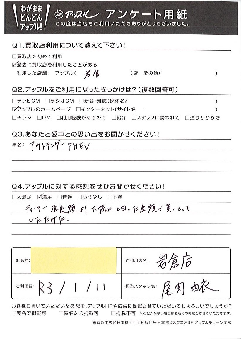 お車のご相談・ 査定だけでもOK! カンタン 入力 30秒 アップルがブランド買取始めました! お電話でも受付中! 受付時間10:00~19:00 0587-66-2021 お車のご相談・ 査定だけでもOK! カンタン 入力 30秒 アップルがブランド買取始めました! お電話でも受付中! 受付時間10:00~19:00 0587-66-2021 アップルがブランド買取始めました! お電話でも受付中! 受付時間10:00~19:00 0587-66-2021 店舗情報 在庫車 スタッフ紹介 ブログ お客様の声 キャンペーン お得 無料査定 click お客様の声 ご記入日: -/-/- O・M様 ディーラー査定額より大幅に上回った金額で買い取っていただけた 前へ 次へ お客様の声一覧を見る