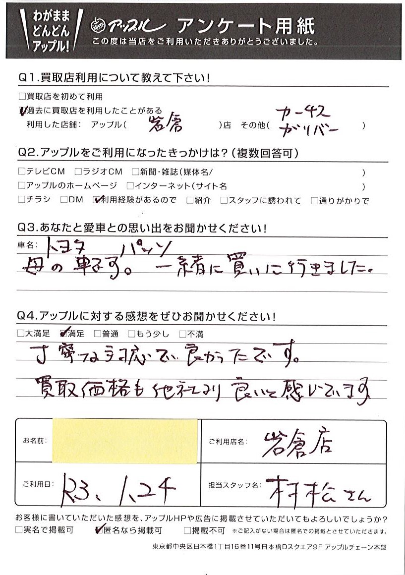 お車のご相談・ 査定だけでもOK! カンタン 入力 30秒 アップルがブランド買取始めました! お電話でも受付中! 受付時間10:00~19:00 0587-66-2021 お車のご相談・ 査定だけでもOK! カンタン 入力 30秒 アップルがブランド買取始めました! お電話でも受付中! 受付時間10:00~19:00 0587-66-2021 アップルがブランド買取始めました! お電話でも受付中! 受付時間10:00~19:00 0587-66-2021 店舗情報 在庫車 スタッフ紹介 ブログ お客様の声 キャンペーン お得 無料査定 click お客様の声 ご記入日: -/-/- T・M様 母の車です。一緒に買いに行きました。丁寧な対応でよかったです。買い取り価格も他社より良いと感じています。 前へ 次へ お客様の声一覧を見る