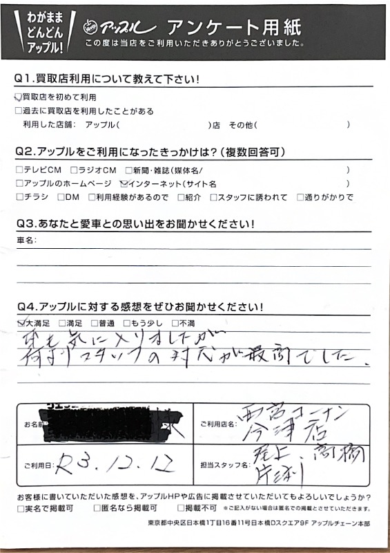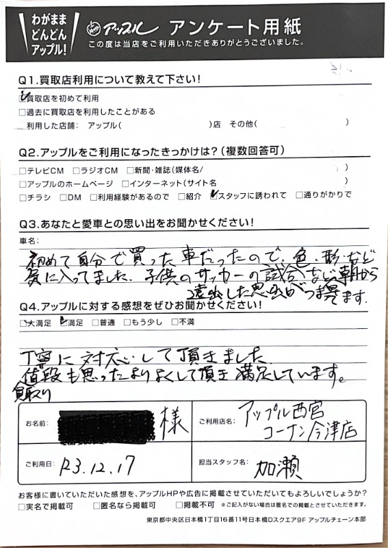 お車のご相談・ 査定だけでもOK! カンタン 入力 30秒 アップルがブランド買取始めました! お電話でも受付中! 受付時間9:30~19:00 0798-23-9033 お車のご相談・ 査定だけでもOK! カンタン 入力 30秒 アップルがブランド買取始めました! お電話でも受付中! 受付時間9:30~19:00 0798-23-9033 アップルがブランド買取始めました! お電話でも受付中! 受付時間9:30~19:00 0798-23-9033 店舗情報 在庫車 スタッフ紹介 ブログ お客様の声 キャンペーン 無料査定 click [ つぶやき ] 2022/01/26 (水) 18:42 ありがとうございます(*^^*) こんにちは( ^^) _U~~アップル西宮コーナン今津店です★☆嬉しいお言葉がたくさん届きました(#^.^#)アンケートはがき、Google口コミとみなさまから頂きました、、、!!☆本当にありがとうございます(^^ゞ少しでもみなさまに良かったと思っていただけるように頑張って参りますので、今後ともよろしくお願いいたします!!!みなさまのご来店、ご連絡、どしどしお待ちしております!!!(*^^*) 2022-01-26 18:42:30 新しい記事へ 古い記事へ 最新記事 ◆夏季休業のお知らせ◆☆在庫車両紹介☆ ジャガーXタイプ☆在庫車両紹介☆ ヴィッツ☆在庫車両紹介☆ ベンツVクラス◆ゴールデンウィーク休業のお知らせ◆ 店舗情報に戻る 月別アーカイブ 2025年08月(1)2025年07月(3)2025年04月(2)2025年03月(1)2025年02月(1)2025年01月(4)2024年12月(4)2024年11月(3)2024年10月(3)2024年09月(3)2024年08月(4)2024年07月(5)2024年06月(4)2024年05月(3)2024年04月(5)2024年03月(2)2024年02月(3)2024年01月(5)2023年12月(5)2023年11月(1)2023年10月(2)2023年09月(4)2023年08月(1)2023年06月(1)2023年04月(1)2022年12月(1)2022年09月(1)2022年08月(1)2022年06月(1)2022年05月(4)2022年04月(6)2022年01月(4)2021年12月(5)2021年11月(4)2021年10月(15)2021年09月(12)2021年08月(8)2021年07月(4)2021年06月(5)2021年05月(1)