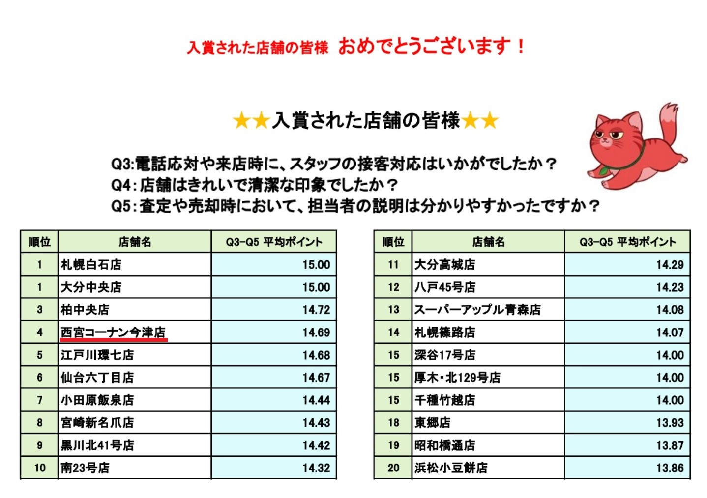お客様満足度ランキングで、アップル西宮コーナン今津店が入賞しました!!