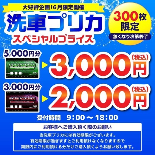 6月はタイヤと洗車プリカ大特価セール中です。