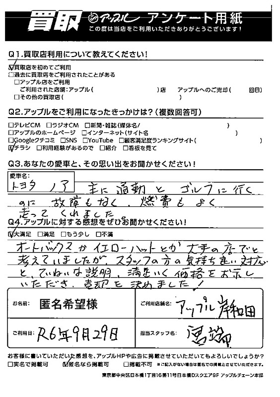 アップルの店舗を訪れると、スタッフが笑顔で出迎えてくれました。査定は無料で、愛車の状態を丁寧に確認し、査定額の根拠を詳しく説明してくれました。また、査定額が決まるまでの間も、無理な営業や駆け引きは一切なく、「お客様が納得してから決めてください」というスタンスが伝わってきました。