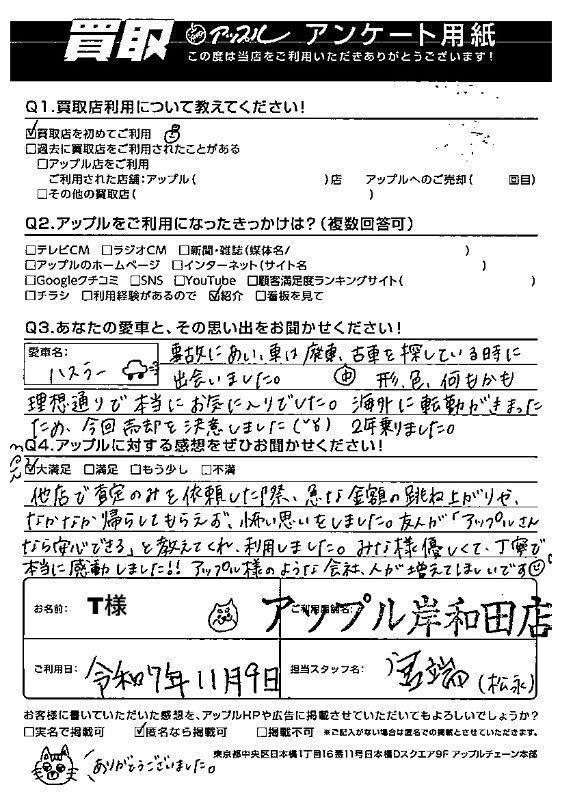 アップル岸和田店をご利用いただいた際の感想をご紹介いたします。