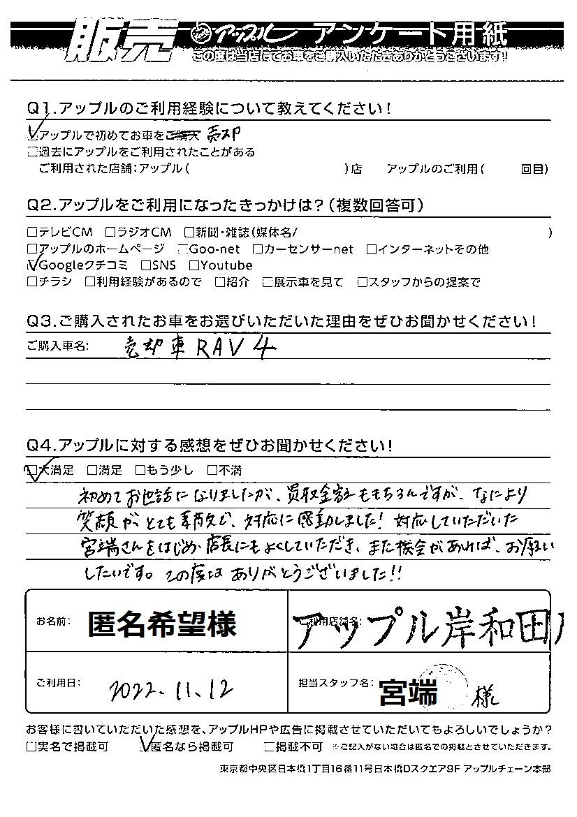 対応していただいた宮端さんをはじめ店長にもよくしていただき、また機会があれば